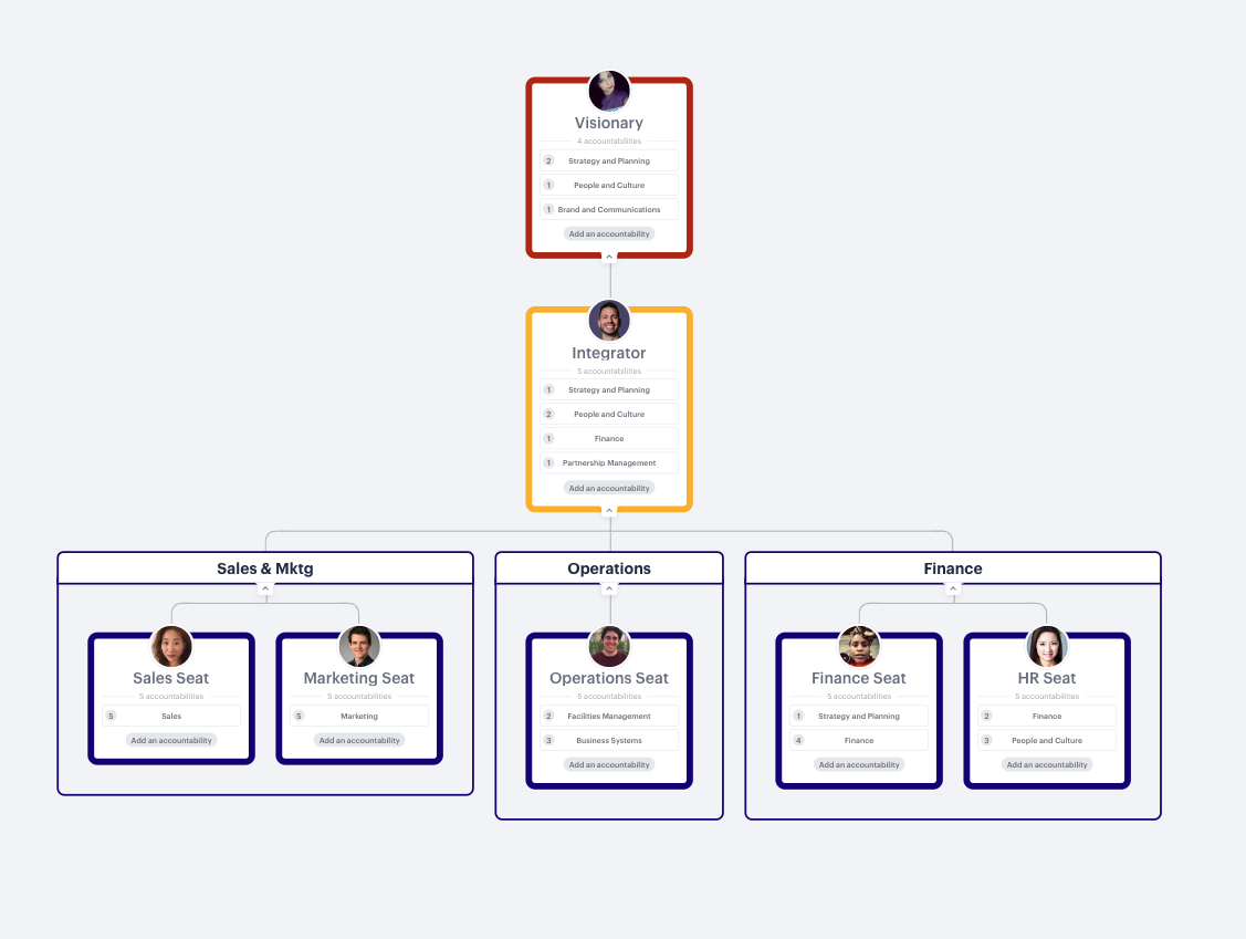 This executive accountabilities template allows leaders and executives to follow business operating systems like Entrepreneurial Operating System (EOS) . If you're a part of an accountability-driven organization, you already know the power of aligning your team around a common vision and setting clear expectations for each role. Our executive accountability chart template gives you over 100 pre-loaded accountabilities across 14 common business functions. It delivers an amazing head start so you can follow a comprehensive framework to define your company's seats (positions), clarify hats people wear (roles), and ensure everyone is accountable for their core business functions.