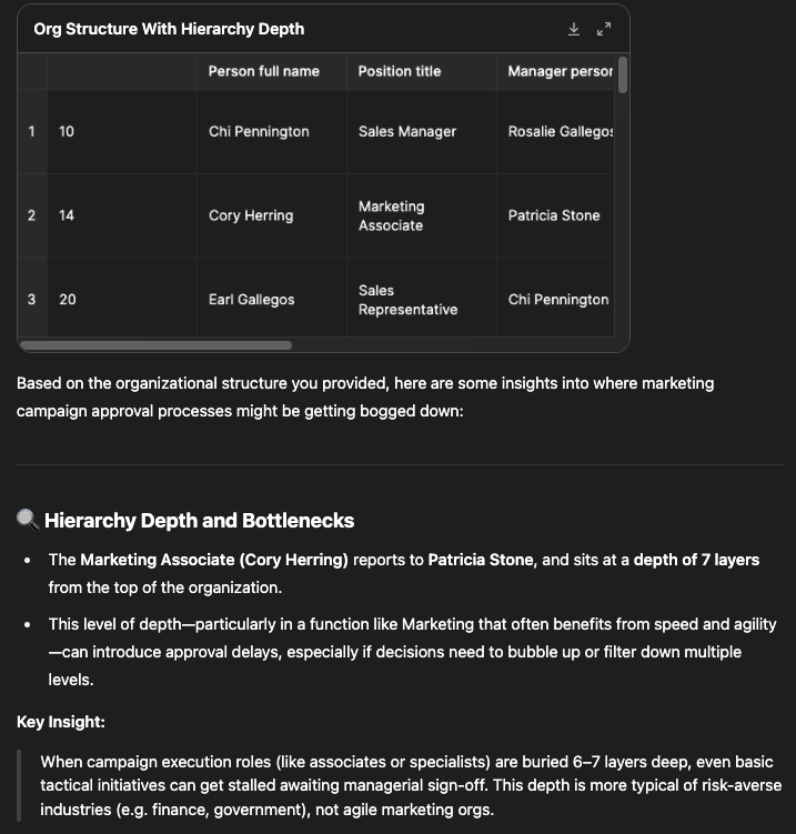 Screenshot of conversation in ChatGPT. Prompt was "Based on our current structure, where might we be creating unnecessary approval steps that slow down our marketing campaign launches?" and GPT was provided with a CSV file of current reporting lines and staff details.
