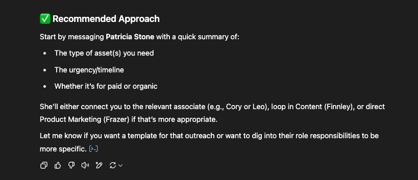 Screenshot of conversation in ChatGPT. Prompt was "Based on this structure, who should I connect with in Marketing if I need help with social media assets?" and GPT was provided with a CSV file of current reporting lines and staff details.