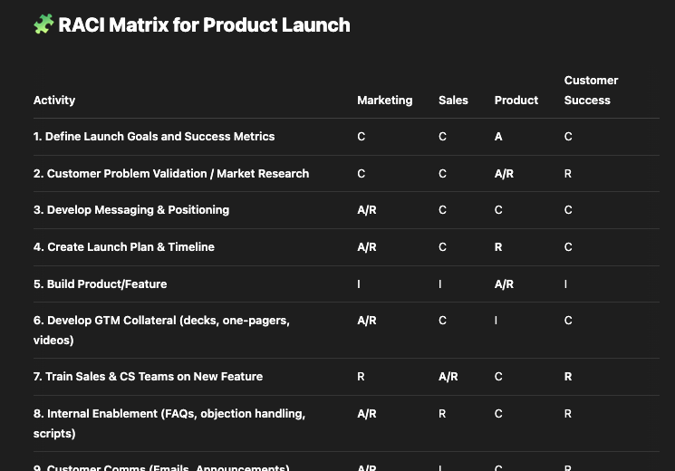 Accountability matrices become clearer and more comprehensive. Try asking: "Create a RACI matrix for our product launch process, including Marketing, Sales, Product, and Customer Success roles." AI can map out who's Responsible, Accountable, Consulted, and Informed for each process step, helping prevent those "I thought you were handling that" moments that derail projects.